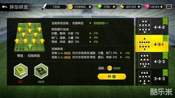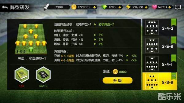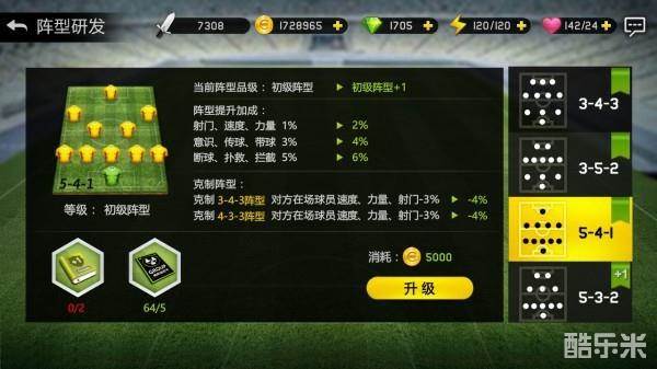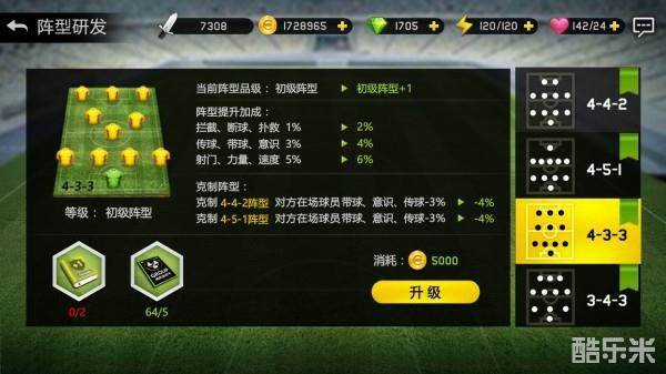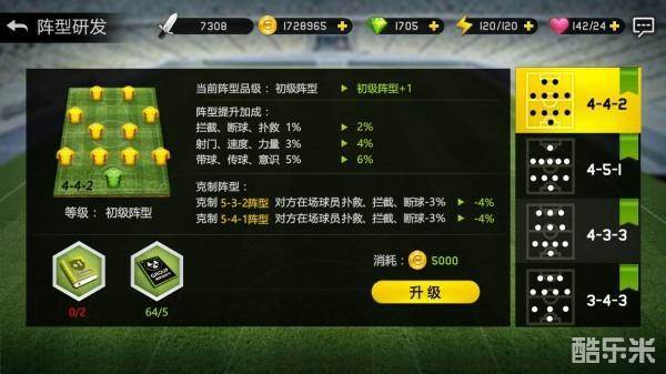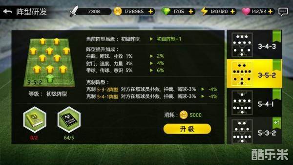 可以看得出7种阵型都提供了不同属性加成,通过阵型升级消耗阵型站位卡和阵型卷轴可以提升阵型的属性加成,不同的阵型之间还存在相互克制的关系,当对方的阵型被我方阵型克制时,我方球员可以获得属性加成。