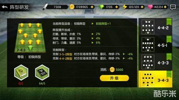 在游戏中目前共有7种阵型4-4-2,4-3-3,5-4-1,3-5-2,5-3-2,4-5-1,3-4-3,4-4-2。