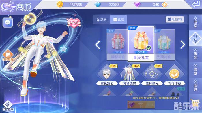 男生购买“星辰礼盒”有机会获得“雪色凌云”发型、“黄雀悠悠”套装、“琉月星光”光效等装扮。男生一头雪白的短发非常炫酷,银色为主的套装还搭配了一些橙色元素,有“太空服”的造型感;外披透明斗篷,增添了一些神秘感;银色的短靴搭配橙色鞋带,撞色的搭配既有时尚感,也是非常帅气的点睛之笔,这一套帅气的服饰搭配起来是非常干净舒服的!