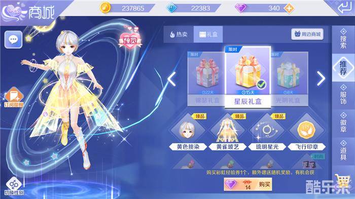 女生购买“星辰礼盒”有机会得到“黄色挑染”发型、“黄雀玻艺”套装、“琉明星光”光效等物品。女生的短发银色与橙色相间,非常时尚并带着帅气之感,短裙也是融合了白色、橙色、浅黄色的色彩搭配,裙子外摆是透明造型,像一颗天上的明星,这样一位干练又优雅的仙女想必是人见人爱了!