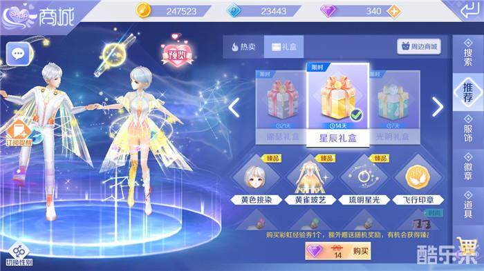 玩家只需要在5月31日至6月27日之间登录QQ炫舞手游商城,就可以看到“星辰礼盒”情侣套装。最重要的是,“星辰礼盒”原价20个钻石,而现价只需要14钻石就可以购买了哦,幸运的童鞋将会从中获得浪漫的星辰情侣套装!下面我们一起来欣赏一下这款浪漫情侣套装的具体效果吧。