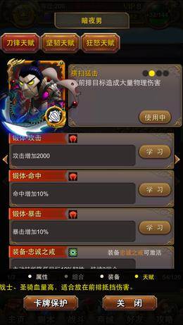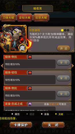 浴血奋战,为随机3个友方附加精神霸体,满级后30%概率抵抗所有减益效果,持续1回合