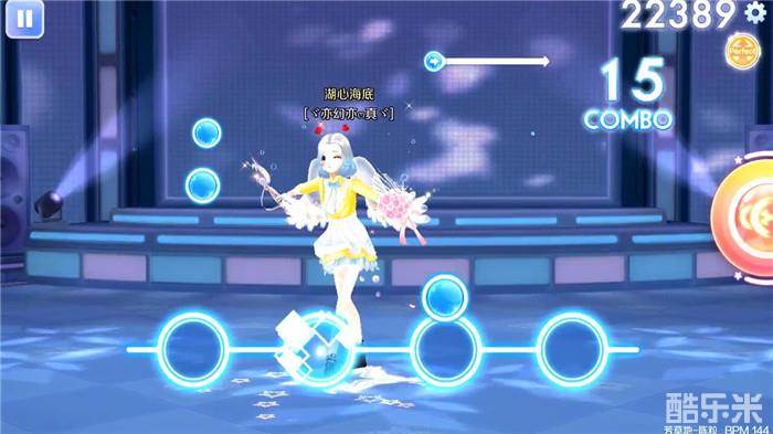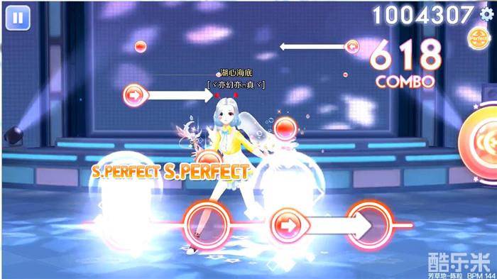 在歌曲的副歌部分,是比较有难度的。双手以同时单击音符开始,左手滑动音符的同时右手单击音符;左手边和右手边分别滑动音符几组,并且在滑动音符的过程中还夹杂着一些无规律无节奏的单击音符;左手右手分别快速单击音符之后,左手是快速的滑动音符。在这部分音符组合当中,要求大家眼明手快,所谓“天下武功,唯快不破”,在快速下落并且非常密集的音符群中,只有手速够快才能保证不丢分哦。