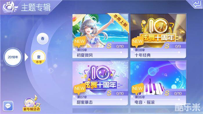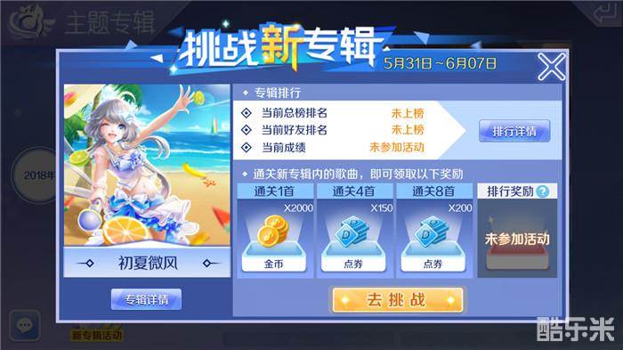 玩家在挑战主题专辑的同时还可以参与“挑战新专辑”的活动,通关1首歌曲、4首歌曲、8首歌曲的同时还可以获得金币与点券哦!另外在完成这一章节新专辑歌曲的挑战之后,大家还可以凭借S的数量拿到点券和七彩贝壳,对于各位小主人来说是不是非常美好的福利呢?