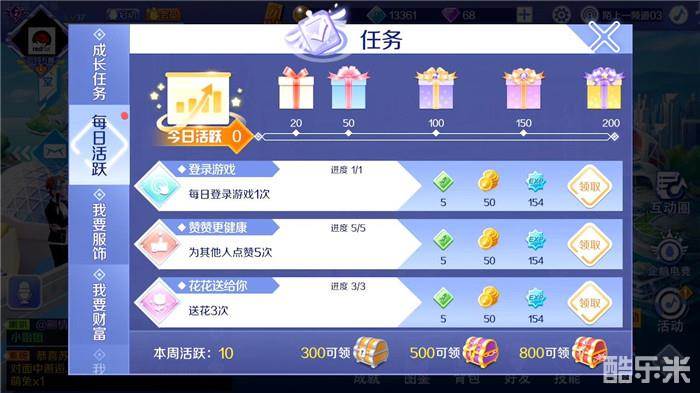 我们来看看游戏的每日任务构成;实际上,在QQ炫舞手游中,日常任务被划分到了每日活跃中,主要获得各种金币以及经验奖励,方便大家升级。进入每日活跃界面,当前的内容,我是真的很意外。每日登录游戏一次?送花3次?给他人点赞5次?不要太简单啊,谢谢。每日登录不用说了,送花、点赞,花园界面轻松操作啊。每天都有人给自己点赞,直接回赞就搞定,顺带再送个花就OK。