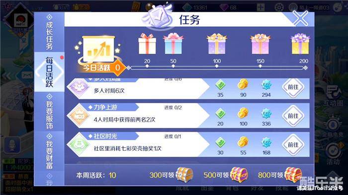 说到难度,难度就来了;4人对局中获得前两名2次。这个稍微要点技术了,不过紧接着的任务是要求多人对局6次,完全可以依靠匹配6次来完成了;一直匹配下去,总有匹配到另外两个人技术都不如自己的吧。任务完成后再依靠活跃度礼盒里送的鱼饵、藏宝图去社区里参与下活动、抽个奖什么的,又是一个任务奖励。