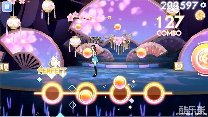 在歌曲的副歌部分,我们会遇到大量的相同类似的音符组合,需要我们在长按音符后直接进行三个快速单击音符,最重要的是这三个单击音符是分别落在三个不同的音符圈里。而到这里还未结束,紧接着双手需要同时单击四组音符。在这一连串的音符“攻击”中,手指在屏幕上需要大量的变动,而不同的音符在短时间内快速切换,也加大了我们的操作负荷。所以当我们在进入副歌部分后,一定要注意音符的变化阶段;如果发现进入快速转折“区段”,一定要提前集中注意力,不要误操哦!