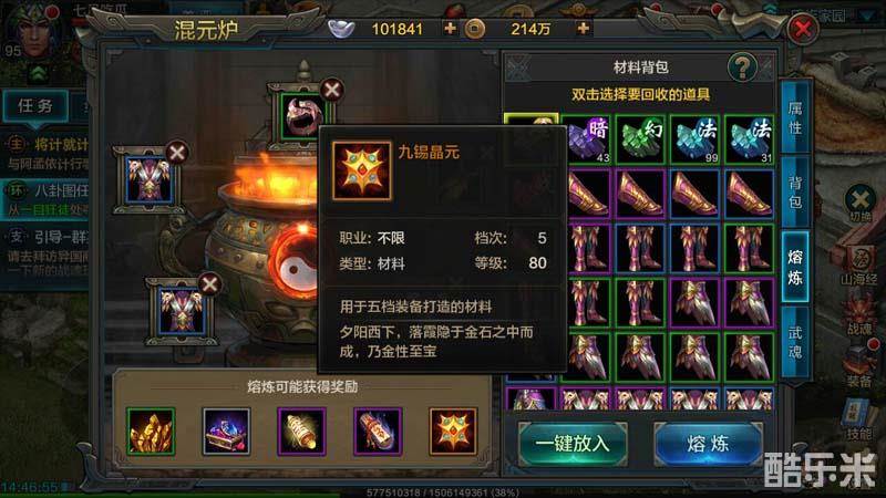 在混元炉中可以选择一键放入材料,系统会自动放入5件材料背包中的装备,会根据装备的档次、品质和评分等因素由低到高加入材料。如果担心一键放入材料会将背包中尚有用处的装备放进去的话,也可以在材料背包中手动选择材料放入,手动选择材料需要双击材料图标才可以放入,在放入5件材料中点击熔炼即可完成。