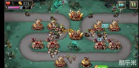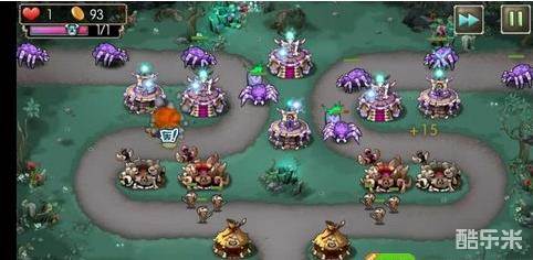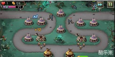 1、初始布局如下,两个2阶炮塔,2个勇士塔,2个法师塔都是在靠近终点的底下。接着继续建造炮塔,无需升级,将其他所有位置都放上法师塔;