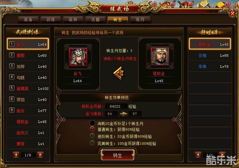 具备以上条件后,我们可以把之前训练过的差武将经验转生到好武将身上,此时只要选择【转生目标】武将,再选择【转生源】武将,点击下面的“转”,就可以把武将的经验转上新武将身上了。