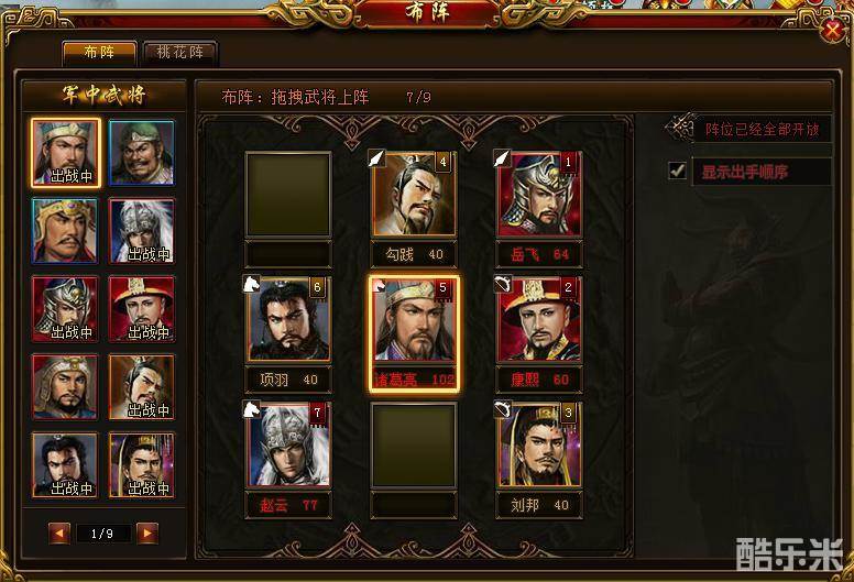 布阵:通过武将排兵布阵,决定武将站位及出手顺序。