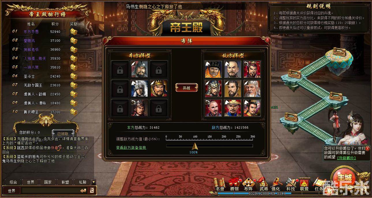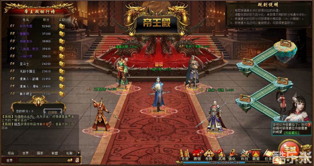 简单来说,帝王殿就是一个可以把玩家当成BOSS来打的地方,里面出现的都是玩家的人物。满足什么条件的玩家才能出现在帝王殿里呢?当然是高手中的高手,竞技场排名前50名以及前一天通关帝王殿获得最好成绩的玩家就是你将会遇见的对手。怎么样,你怕了没有?