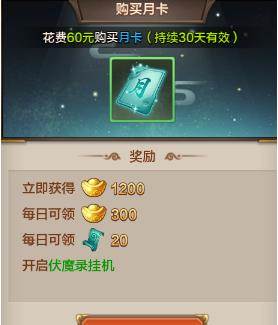 在游戏中,玩家可以在主界面中点击首冲奖励的图标,进入之后点击充值之后,即可看到都买月卡的选项,玩家只需要充值60元人民币即可获得月卡。同时拿到大量的月卡奖励。