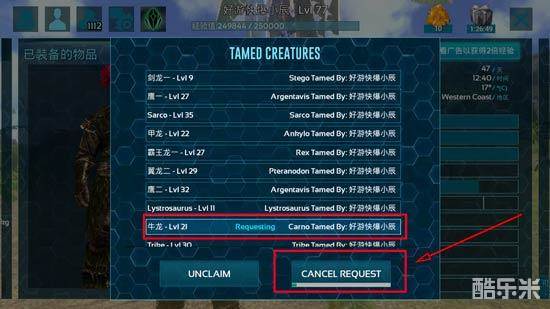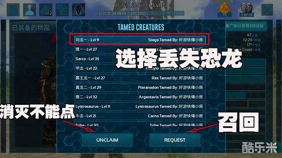 3、如果能找到你丢失的龙,那么恭喜,你的宝宝还幸存的,咱们可以使用召回功能,选择丢失的恐龙,点击下方的REQUEST召回(旁边的UNCLAIM是消灭恐龙,别搞错了!)
