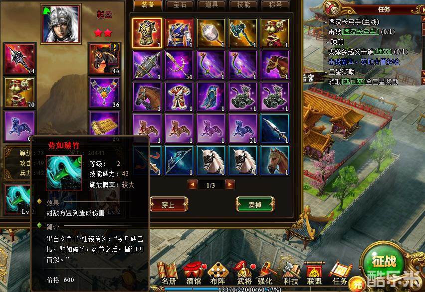 建议在得到威力大的技能后优先给攻击最高的武将装备,一些比较有价值的技能最好升级到4级以上。比如红色品质的武将技能“势如破竹”,1级时的技能威力是32,4级的技能威力可以达到65,让拥有较多缘的赵云或者马超装备,一旦发动技能,杀伤力简直超乎你想象!