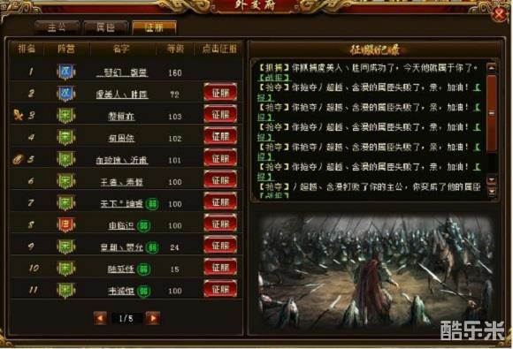 国战系统每天开启之后,在结束之前会将战力最高的人封为国王。欢乐园《帝王霸业》就如同在东汉末年分三国,各自为战,是否像曹操那样挟天子令诸侯,统领百万大军,逐鹿中原,就看各位帝王之才施展逐鹿天下之能。国战系统每次结束之后都会拥有一份丰厚的国战奖励,想要赢得国战胜利不仅要拥有绝世名将,还要看准时机别错过了兵家必争之地。胜利之后会获得国王加冕标志,昭告天下,用双手来成就你的梦想,变身王者。