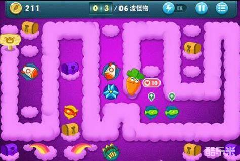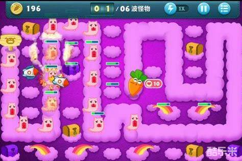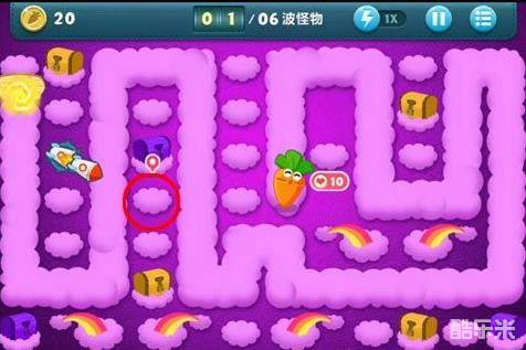 1、开局先在怪物出口放个火箭炮,升到2级打下图标示的云朵,注意不要让小怪跑掉了,前面2波是关键。