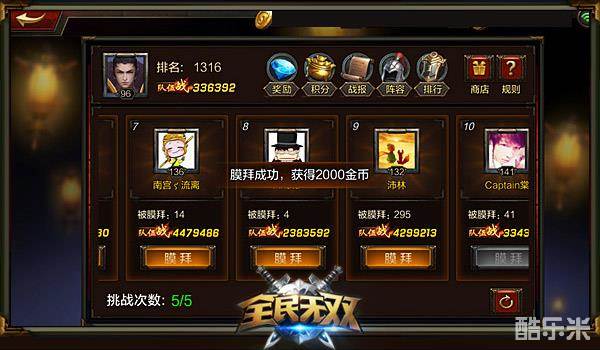 竞技场左侧可以向右滑动,查看竞技场排名前10的信息并且进行膜拜,膜拜一次可以获得2000金币,每天可以膜拜10次计2万金币。