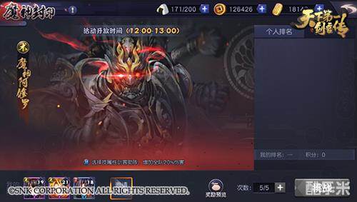 每天12:00-13:00,魔神封印活动将限时开启,各位武士大人们不要忘记及时参与,错过就要等第二天啦。每天有5次挑战机会,用完后还可以购买次数,这样可以提高自己的分数,获得更高的排名哦。