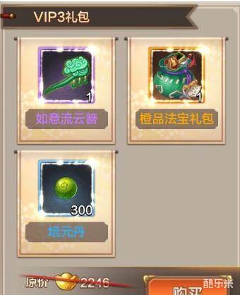 VIP3福利礼包:1个如意流云簪、1个橙品法宝礼包、300个培元丹