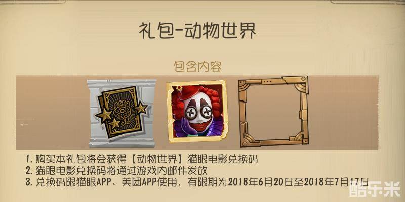 同时,《第五人格》也为玩家们准备了一个动物世界限量礼包。凡是在游戏中购买这个礼包的玩家,都将获得限定涂鸦、头像、头像框以及《动物世界》猫眼电影兑换码。礼包将会在6月21日中午12点上架商城,每人限购一份,且在全服限量,记得准时去抢购哦~