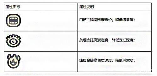 1.游戏中的料理加入了属性系统,不同料理之间的属性是不一样的,共有5种属性。每种料理都会有三种主要属性,分别是:口感、美观、热度。
