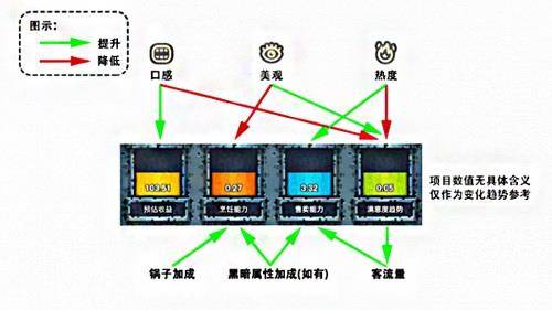 小贴士:之前内测版无料理属性,现在餐厅经营大革新随着料理属性的加入,餐厅的经营模式跟着发生了改变,这也是新版本中变化很大的部分。在过去的游戏中,餐厅的经营内容只有“烹饪→销售”这样简单的环节,无论烹饪售卖什么食物都对餐厅经营影响不大。而在新版本中,由于有了料理属性、黑暗属性和熟练度这些特性,在经营时就不能像以前一样“唯利是图”了,需要全面考虑收益、烹饪能力、售卖能力、满意度趋势等各方面因素来决定让大厨做什么料理。不同属性对经营状态的影响如图: