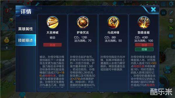 除了大招的金箍天降,孙悟空的其他输出方式均为普攻或使用技能后的强化普攻,孙悟空虽天生自带一定暴击率,但暴击效果较低,不过强化普攻的暴击效果与正常效果无异。这也就使得孙悟空的技能成为孙悟空输出的关键。
