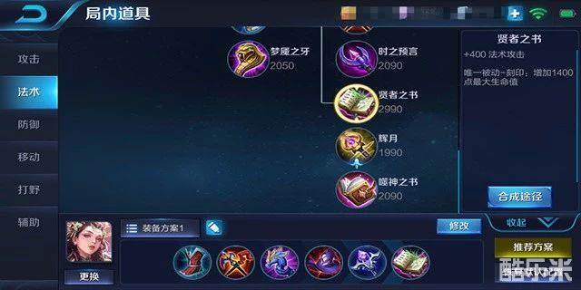 最后一件装备选择较为多变,可选择贤者之书继续提升法术攻击及抗伤能力,也可以选择一些防御性装备来应对敌方伤害过高的英雄,可以选择携带辉月进一步提升杨玉环的保命能力,被切时三技能+金身+闪现能最大限度的保护杨玉环,也能为队友的赶到争取时间(辉月的选择应该更加提前,后期出辉月的意义小很多)