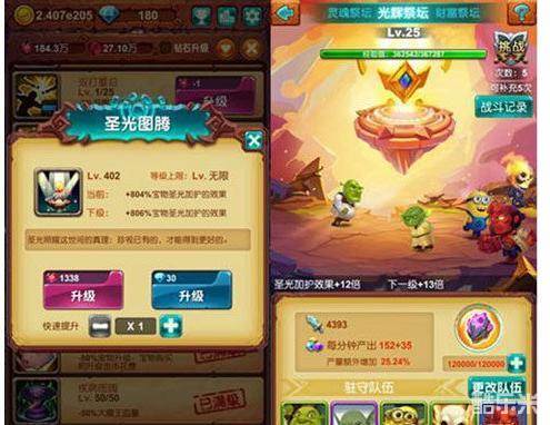 既然圣光转移如此之难,那勇者们只能从增加圣光单体强度的方面来提升自我了。届时图腾与祭坛的作用就脱颖而出,“圣光图腾”可以通过无限制升级来提升圣光对宝物的援护效果,只要一直升级该图腾,圣光所带来的攻击力加成可是无穷无尽的哦~其次就是“光辉祭坛”对圣光的提升效果了,虽然不如图腾提升的那样明显,但是终归是有所提升的,所以勇者们一定不能将其放弃!