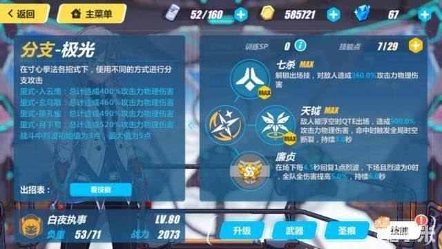 天相:这个技能就厉害了,40%物理免伤,比月轮的仅限于流血还强,霸体更是不讲道理,充分防止了被一矛戳到死的情况。何况还提供烈波,毫无疑问的T0技能,必须优先点满。注意,AAA和BBB的最后一击打中几个敌人增加几点烈波!