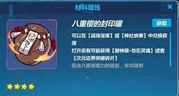 次元的产出方式是八重樱的封印罐。封印罐开出勿忘碎片的几率要大不少,次元碎片的产出效率较低。
