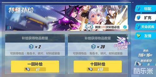 如下图中,扩充补给角色为「白骑士·月光」,如果舰长参与了70次本期扩充补给,舰长在下一期扩充补给开放时,第一次进入扩充补给界面,将会看到剩余30次补给必出「UP的S级女武神」。