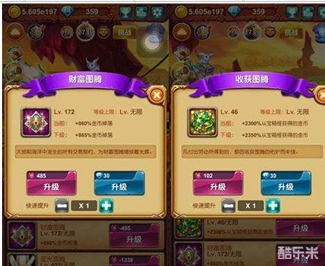财富图腾和收获图腾,作为图腾中的佼佼者,正好是为我们提升金币的获得量,并且这两个图腾都是无限升级的,这就意味着只要我们为其升级,我们获得的金币将越来越多!但是大家要注意的是,虽然这两个图腾带给我们的收获很大,但是升级起来也是很不容易的,一定要多注意自己的英雄之魂数量,不要因为升级图腾而把自己积攒多时的资源都消耗点哟!