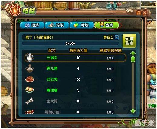 4、 双击使用庖丁书籍后,在人物技能中的合成选项中就可以合成庖丁物品了,同时在此页面可以查看副职的等级和当前等级的经验值。
