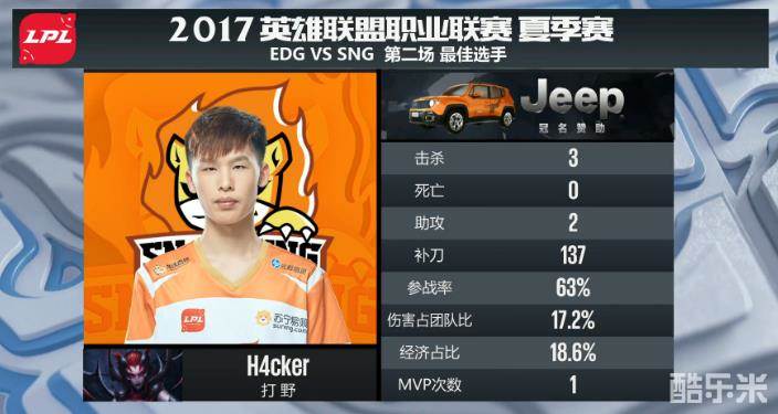 双方打野均是下半部野区开,本局比赛,SNG打得非常的主动,利用线上英雄的强势,SNG快速的推塔侵占EDG野区资源,SNG很快的便在前期建立起经济优势。比赛进入中期,EDG想要通过抓SNG单带的武器大师来挽回劣势,但是并没有太好的效果,武器大师的单带为队友拉扯出空间,SNG进而进一步推塔扩大优势。在28分钟时,EDG中上大招强抓武器失败,SNG直接rush大龙逼迫EDG开团,挖掘机抢龙失败,SNG拿下大龙后一波摧枯拉朽的团战将EDG团灭,随后SNG一波将EDG基地推掉,拿下了今日比赛的胜利,恭喜SNG。