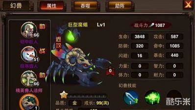 从上面的图我们可以看出作为一只迷之BOSS它的属性是很不错的,当是这只幻兽的技能却不怎么样,作为一只迷之BOSS可谓格斗之皇金字塔顶端的幻兽了,却只有两个技能。成长是满的99上限,最大等级是100级,目前是格斗之皇中可以成长最高等级了!近攻型幻兽攻击力1087这个是不达标滴,比女王差远了!