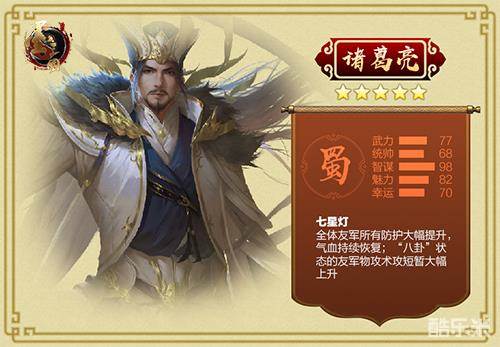 诸葛亮的基础属性值为:武力77,统帅68,智谋98,魅力82,幸运70,是所有武将中智谋最高的。