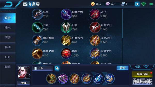 上单出装:影忍之足,暗影战斧,无尽战刃,宗师之力,名刀·司命,破军