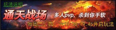 每个周二,周四,周六的晚上19:30~19:45,在限时玩法中即可进入通天战场,参与龙争虎斗!开启通天战场之后,每位玩家都作为一个单独的队伍参战,与其他玩家同台较量。