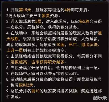 通天战场一共分为五层楼,进入战场之后,玩家其中存活的时间越久,击败的怪物或玩家越多,获得的积分也就越多。而在活动过程中会不断地刷新战旗,获得战旗将会提高你的积分加成,只是如果被击败了的话,战旗也就会被清空了。