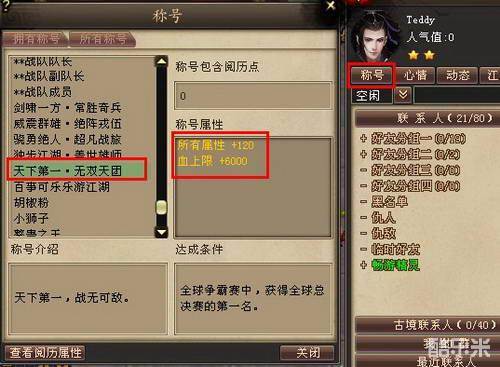 称号系统中,称号具有装饰性的图案,同时,称号可以给人物增加特定的属性。