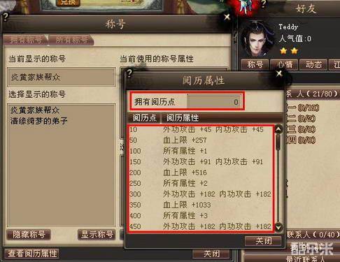 称号系统中引入阅历的概念,附带有“阅历点”属性。当玩家获取一个称号的同时,也会获得包含在称号中的阅历点。每个称号带有的阅历点为0--5点不同。当阅历点累加到一定点数的时候,能够激活隐藏属性。阅历点积累更高,能够获得更多条目的隐藏属性。
