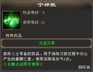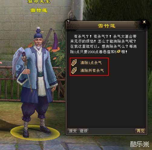 玩家除了可以使用净心丸(元宝商城购买)或者宁神散(野外BOSS掉落)来消除杀气值。还可以在苏州(298,162)雪竹莲处,使用2000点善恶值和5金币来消除1点杀气值。
