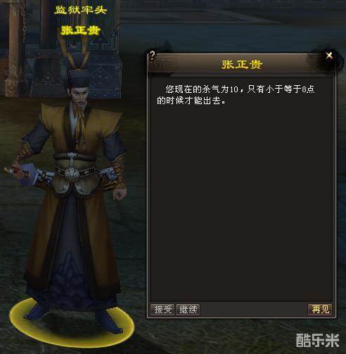 玩家可以通过与监狱(43,31)张正贵对话,来查看自己的杀气值,如果杀气值小于8,则可以传送到大理、洛阳、苏州三城。
