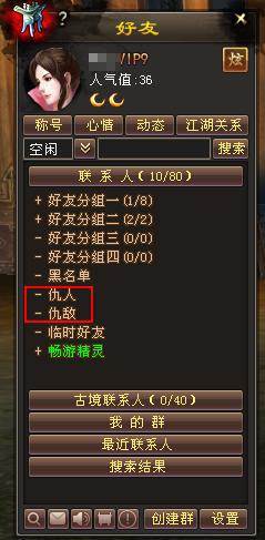 2.打开好友界面(快捷键ALT+F),找到仇人选项卡,右键选中所要转换为仇敌的玩家名,选中右键菜单的“添加仇敌”,即可转换为仇敌;