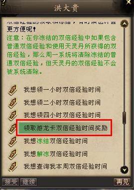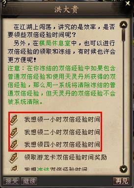 玩家如果一次领取时间太长,此时需要下线而不想浪费,可以找大理(183,141)洪大贵、洛阳(150,90)刘健明、苏州(164,80)沈澄、楼兰(154,119)格鲁尔处进行双倍经验的冻结和解冻操作。