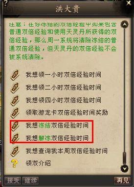 拥有《天龙八部》VIP特权或游龙卡的玩家,可以直接使用特权随时随地对双倍经验,进行冻结和解冻操作。玩家在领取双倍以后下线,未冻结的双倍时间将不会扣除剩余时间。