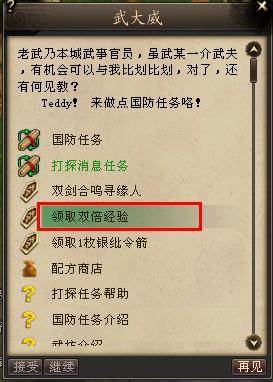 1、玩家如果加入了帮会,而且帮会有自己的城市,可前往帮会城市中的武大威处,每周可额外领取4小时的双倍经验。
