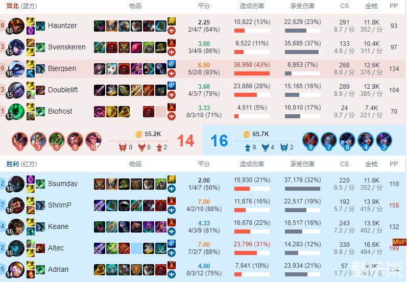 但在10分钟的下路团战中,Doublelift的崔丝塔娜上头试图强杀布里茨反而被勾到,Bjergsen也因为施放大招无法移动被DIG战队中野合伙击杀。上下路的劣势让Bjergsen有有心无力,32分钟时TSM战队在上路惨遭对手茂凯传送绕后强开输掉了比赛。在游戏结束时,Bjergsen的泽拉斯仍然有5/2/8的不错战绩,高达93%的参团率。但第二局Doublelift的崔丝塔娜顺利被打爆,Bjergsen的库奇纵使100%参团率也难以招架经济领先一万的DIG战队五人。北美排名第一的TSM战队遭遇了失利,引起了外国玩家的热议。